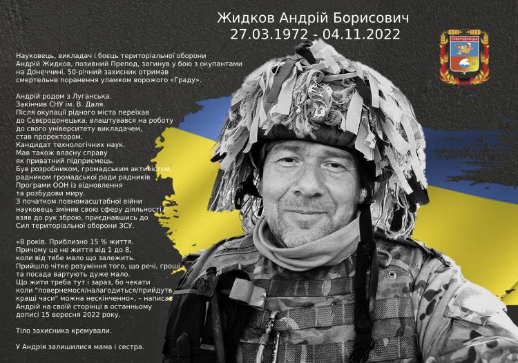 Науковець, викладач і боєць територіальної оборони Андрій Жидков, позивний Препод, загинув 4 листопада у бою з окупантами на Донеччині. 50-річний захисник отримав смертельне поранення уламком ворожого «Граду».