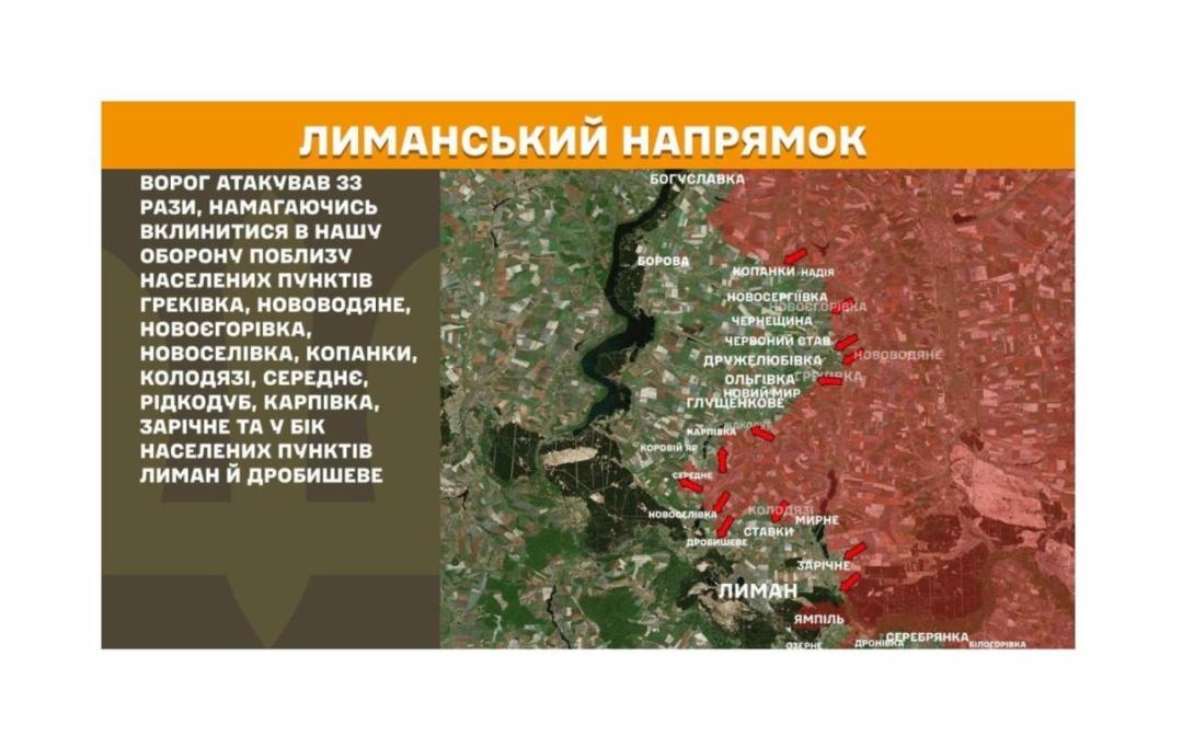 «Минулої доби росіяни влаштували понад 30 спроб штурмів на Лиманському напрямку. На Луганщині вони намагалися просунутися з боку Нововодяного. Також бої точилися в районах Греківки та Новоєгорівки, де тримають оборону українські Захисники, – наголосив начальник Луганської обласної військової адміністрації Олексій Харченко. – На нашій ділянці фронту окупанти здійснили вісім мінометних обстрілів. Спрямували по укріпленнях Сил оборони 20 безпілотників».