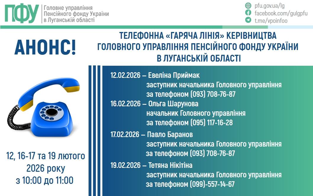 12, 16-17, 19 лютого працюватиме телефонна "гаряча лінія" керівництва Головного управління Пенсійного фонду України в Луганській області.