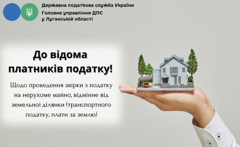 Головне управління ДПС у Луганській області повідомляє, що З 01 січня поточного року розпочався процес формування та надсилання платникам податків податкових повідомлень-рішень з податку на майно. Для фізичних осіб суми грошових зобов'язань з податку на майно (податок на нерухоме майно, відмінне від земельної ділянки, плата за землю, транспортний податок) визначає контролюючий орган. Податок на нерухоме майно, відмінне від земельної ділянки обчислюється контролюючим органом на підставі даних Державного реєстру речових прав на нерухоме майно, плата за землю – на підставі даних державного земельного кадастру та Державного реєстру речових прав на нерухоме майно.