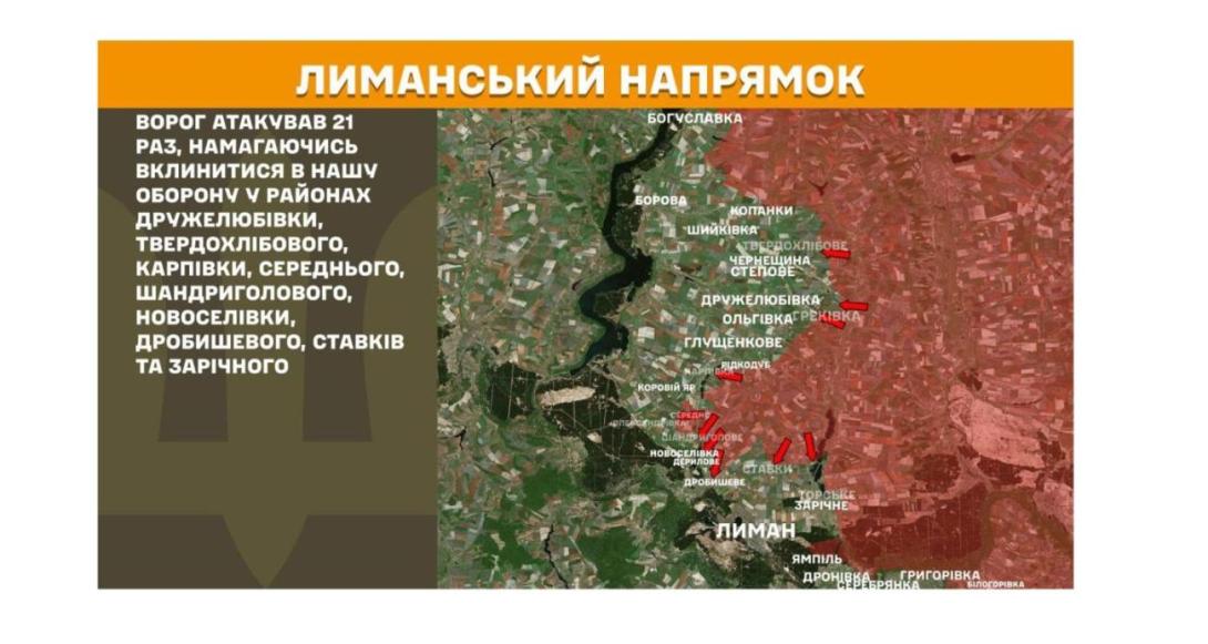 «Минулої доби загарбники здійснили 21 спробу просунутися на Лиманській ділянці фронту. Ще вісім – на Слов’янській. Атакували, зокрема, з боку Твердохлібового, що у Нижньодуванській громаді. Застосовували артилерію, безпілотники, інші види озброєння. Наші бійці тримають оборону на Луганщині», поінформував начальник Луганської обласної військової адміністрації Олексій Харченко.