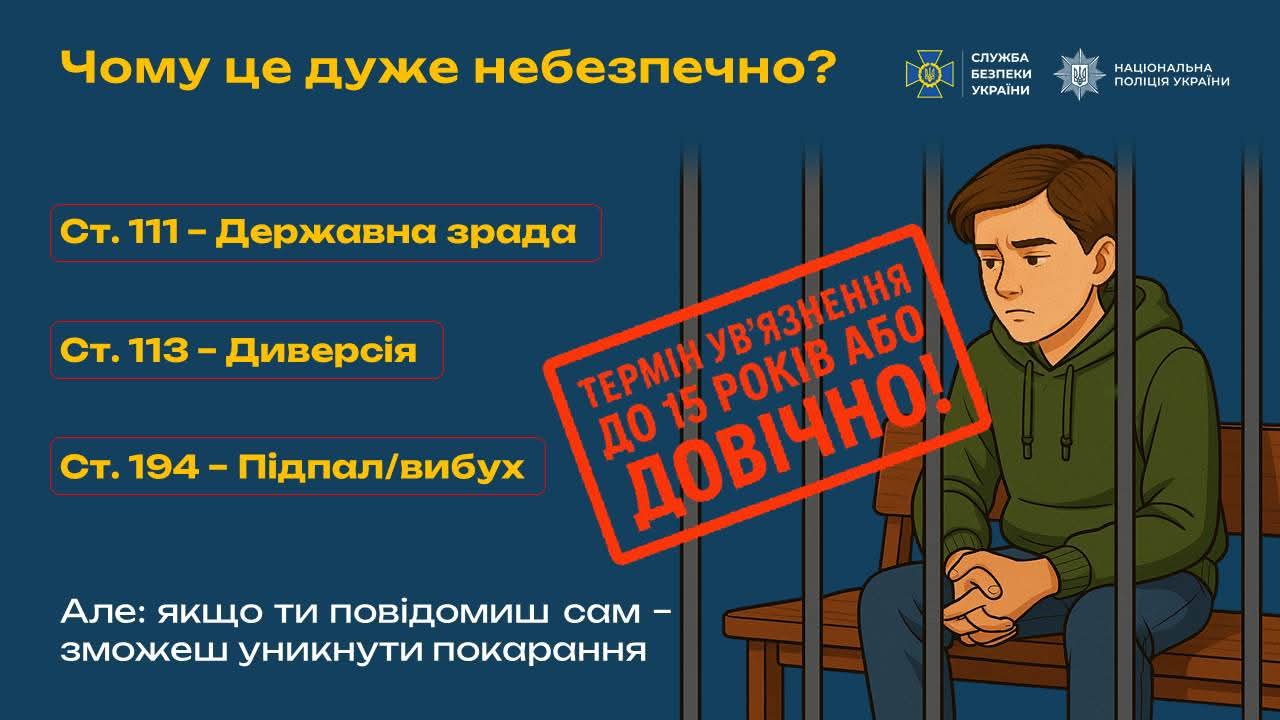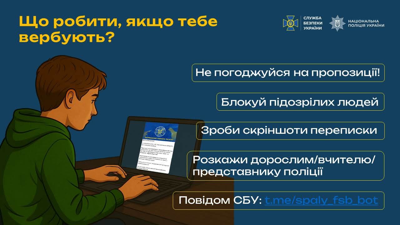 Співробітники СБУ та ювенальної поліції закликали школярів бути пильними й у разі найменшої підозри повідомляти правоохоронні органи -  на офіційний чат-бот СБУ в Telegram «Спали ФСБшника» t.me/spaly_fsb_bot, на гарячу лінію СБУ за номером 0800 501 482, у Національну поліцію за номером 102.
