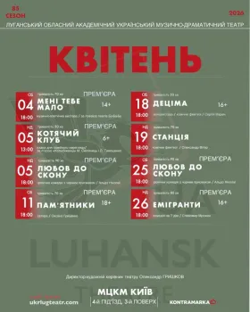 вт, 7 кві 2026 - 15:37 Луганський обласний академічний український музично-драматичний театр запрошує на вистави. Що у репертуарі на квітень?