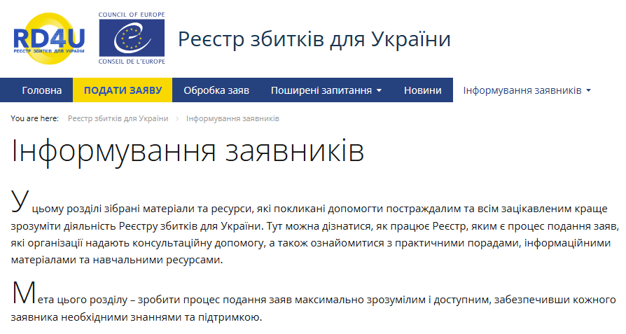Офіційний вебсайт Міжнародного Реєстру збитків для України доповнено розділом «Інформування заявників» (https://rd4u.coe.int/uk/outreach), в якому можна дізнатися, як працює Реєстр, яким є процес подання заяв, які організації надають консультаційну допомогу, а також ознайомитися з практичними порадами, інформаційними матеріалами та навчальними ресурсами.