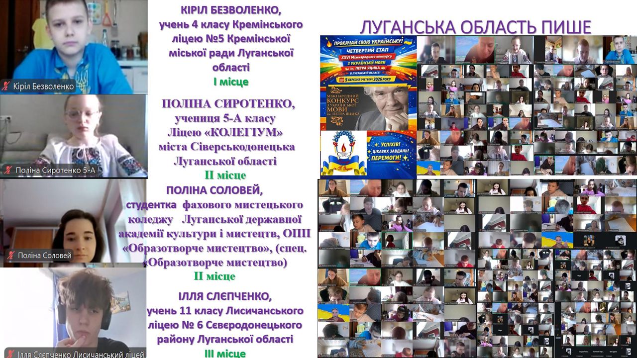 29 юних мовознавців із Луганської області – переможці обласного етапу серед учнів 3–11 класів закладів загальної середньої освіти, а також здобувачів професійної, фахової передвищої та вищої освіти – долучилися до фінального етапу ХХVІ конкурсу разом з учасниками з усієї України та світу.