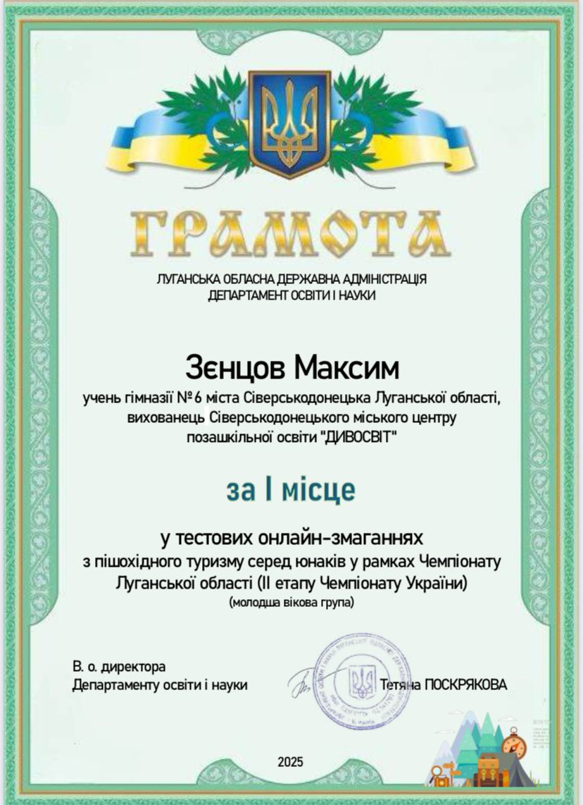 У змаганнях з пішохідного туризму у молодшій віковій групі І місця посіли вихованці гуртка "Пішохідний туризм": Головіна Поліна, Швецова Вікторія та Зєнцов Максим (Керівник - Віктор Кісляков).