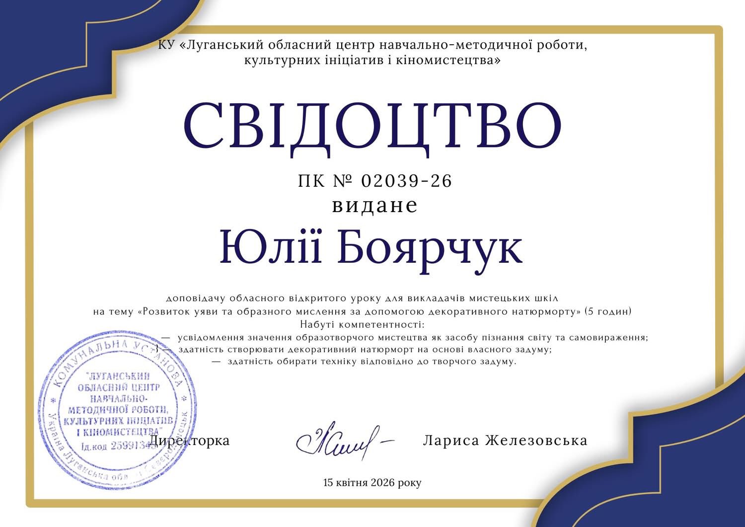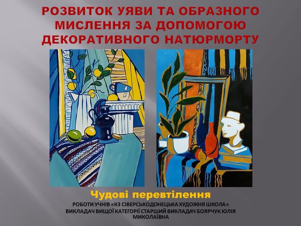 "Розвиток уяви та образного мислення за допомогою декоративного натюрморту" Боярчук Юлії Миколаївни викладача вищої категорії "Старшого викладача".