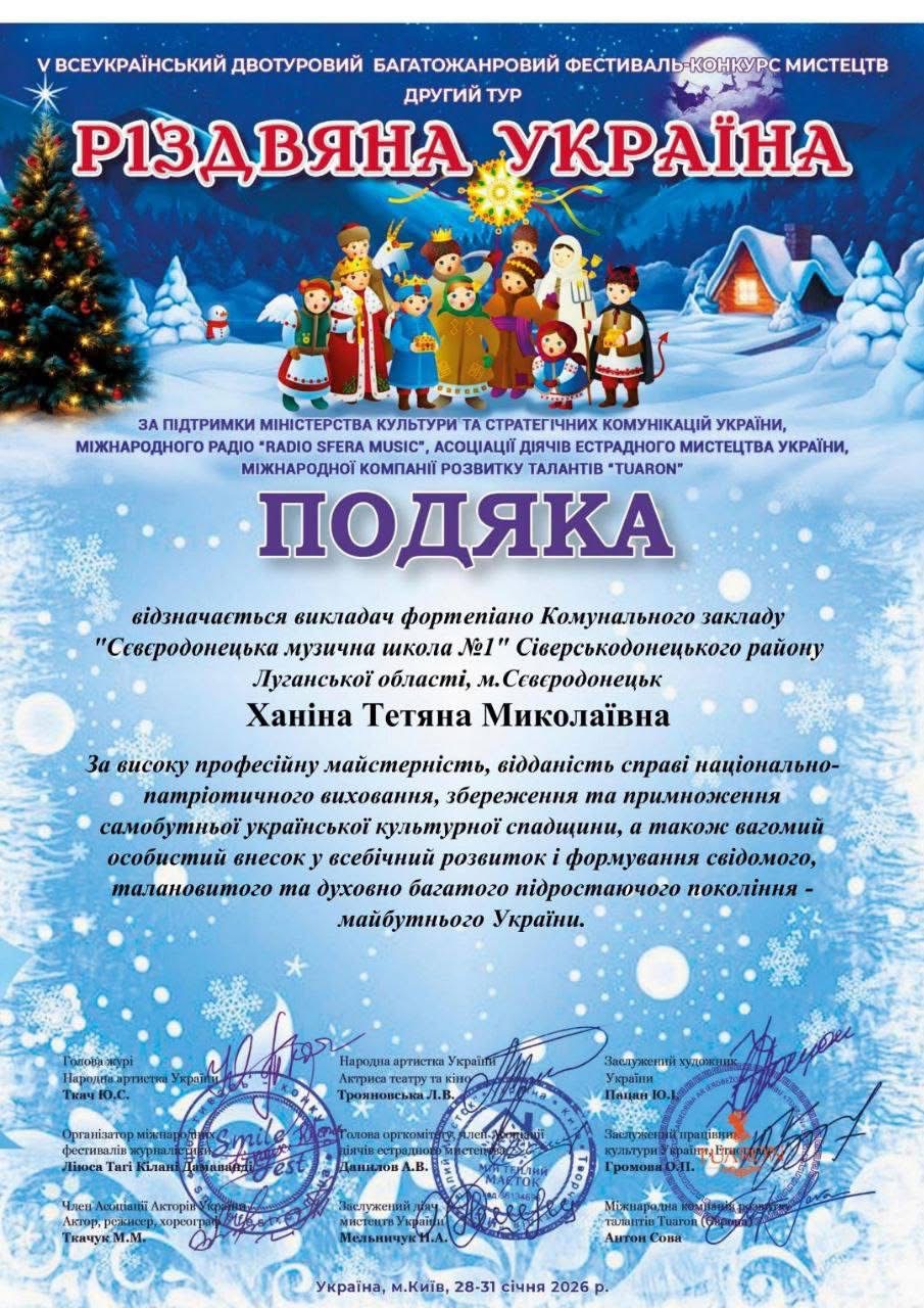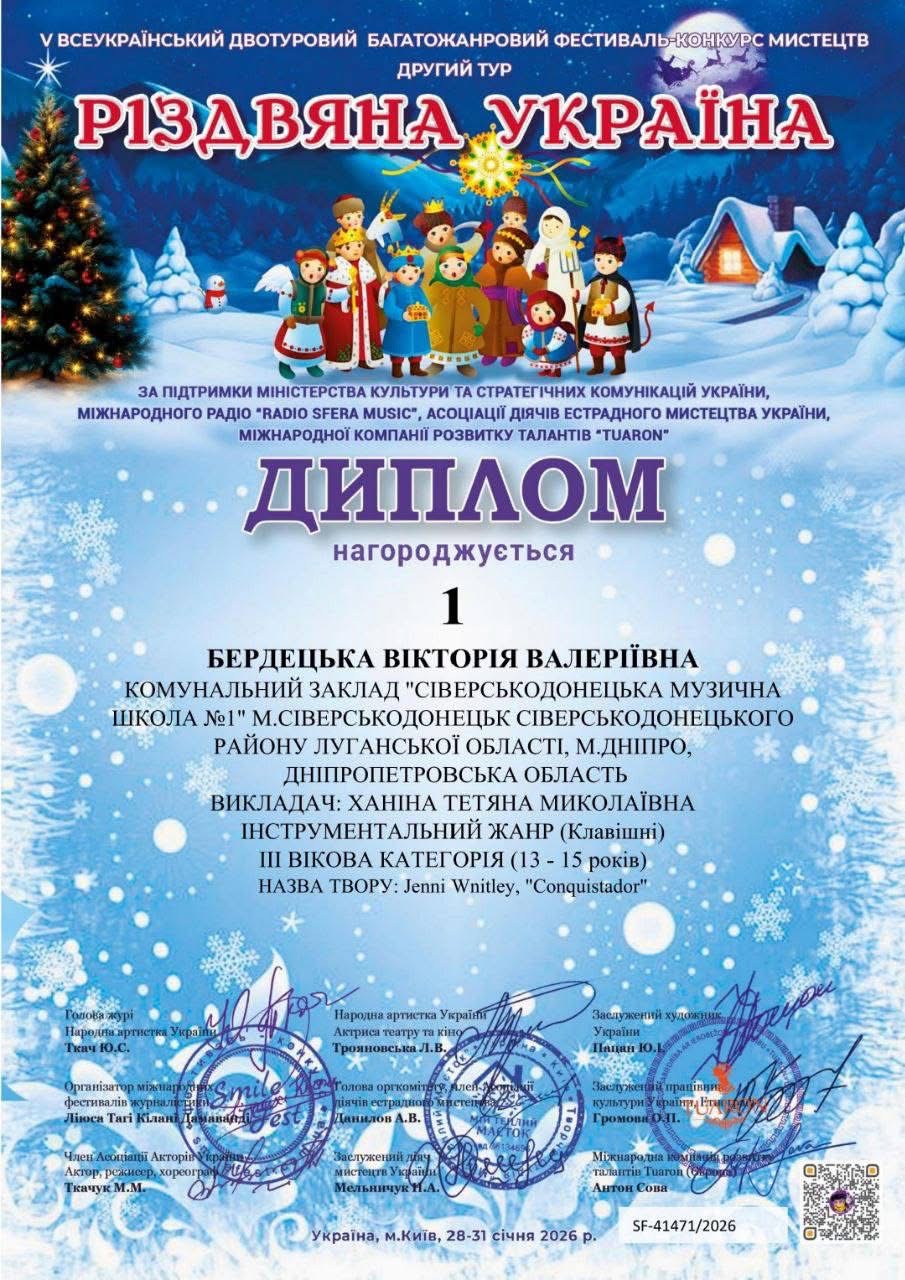 зустрів чудовими результатами нашу конкурсантку Бердецьку Вікторію Валеріївну, ученицю КЗ "Сіверськодонецька музична школа№1" та її викладачку Ханіну Тетяну Миколаївну.