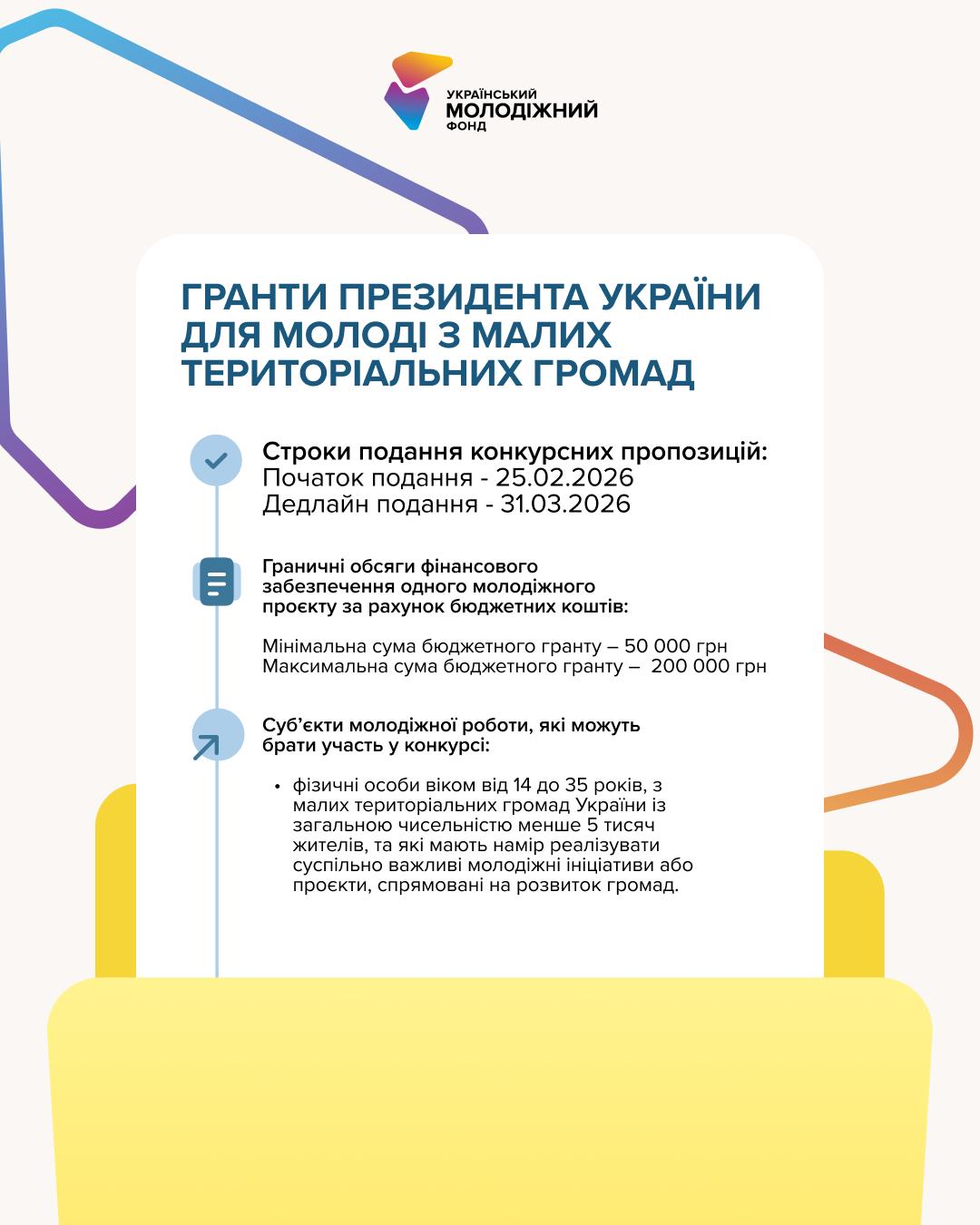 Гранти Президента України для молоді з малих територіальних громад реалізуються Міністерством молоді та спорту України і Українським молодіжним фондом.