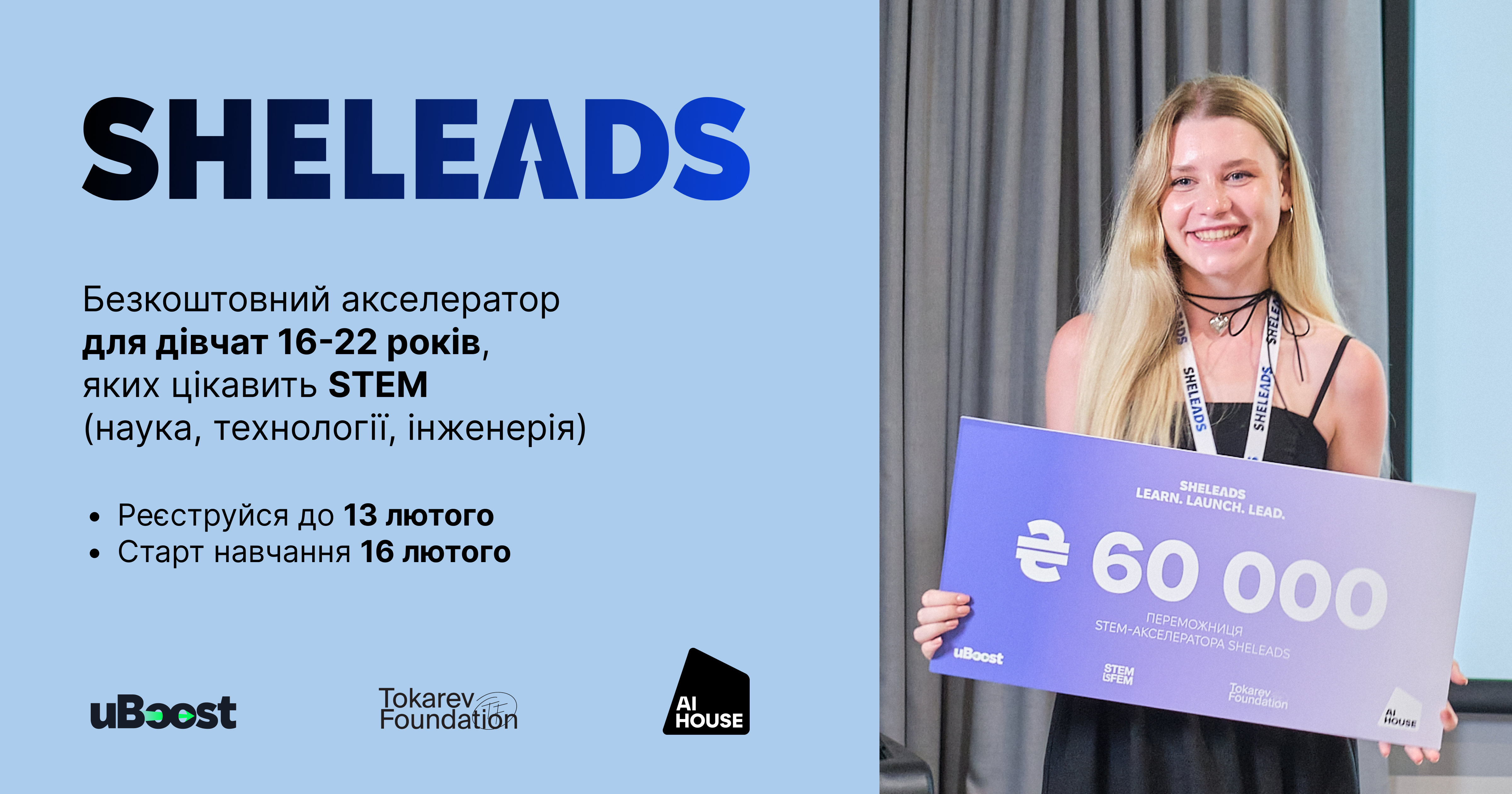 Долучайся до SheLeads — безкоштовного акселератора для дівчат 16–22 років, яких цікавить STEM (наука, технології, інженерія) від uBoost та Tokarev Foundation.