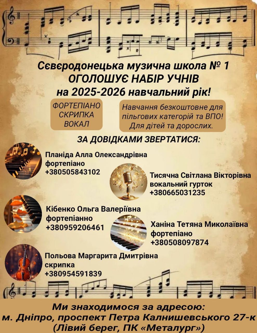 Сіверськодонецька дитяча музична школа №1 оголошує набір учнів на 2025-2026 навчальний рік