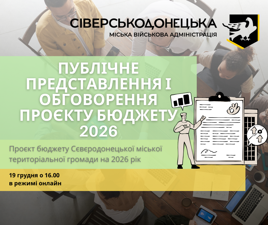 Публічне представлення і обговорення проєкту бюджету Сєвєродонецької міської територіальної громади на 2026 рік відбудеться 19 грудня 2025 року о 16.00 в режимі онлайн.
