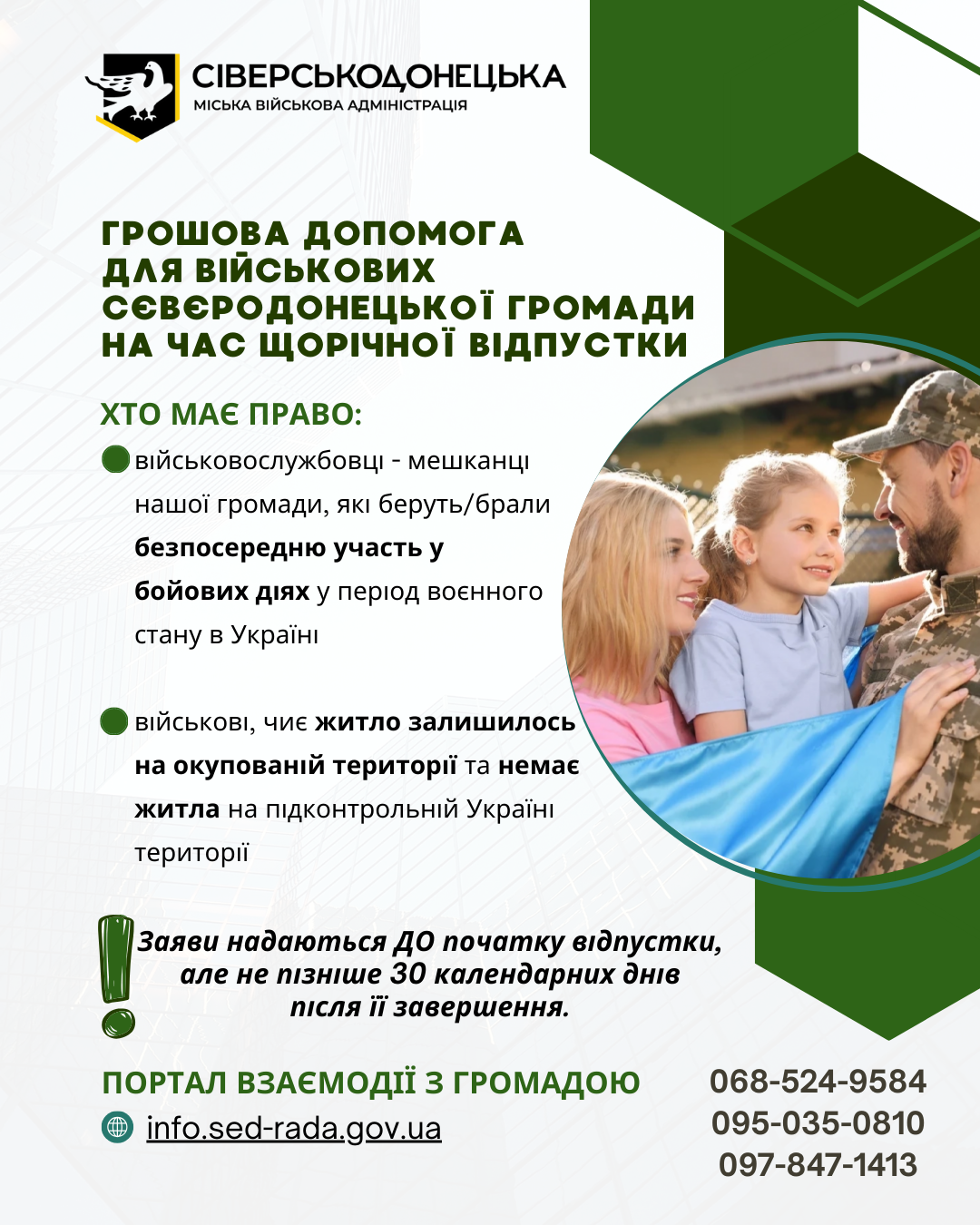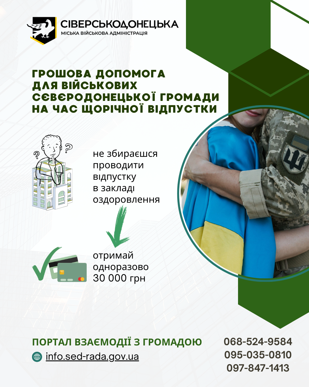 • 11 військовослужбовцям у період відпустки виплачено на загальну суму 330 000 грн