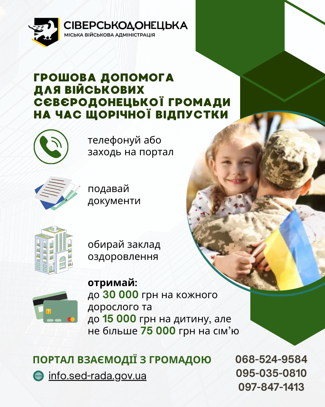 Заходи Комплексної програми підтримки Сєвєродонецькою міською територіальною громадою Захисників та Захисниць України та членів їх сімей на 2025 рік передбачають виплату різних видів матеріальної допомоги. Виплати отримали ще 19 військових Сєвєродонецької громади та члени їх сімей на загальну суму 690 тис. грн: