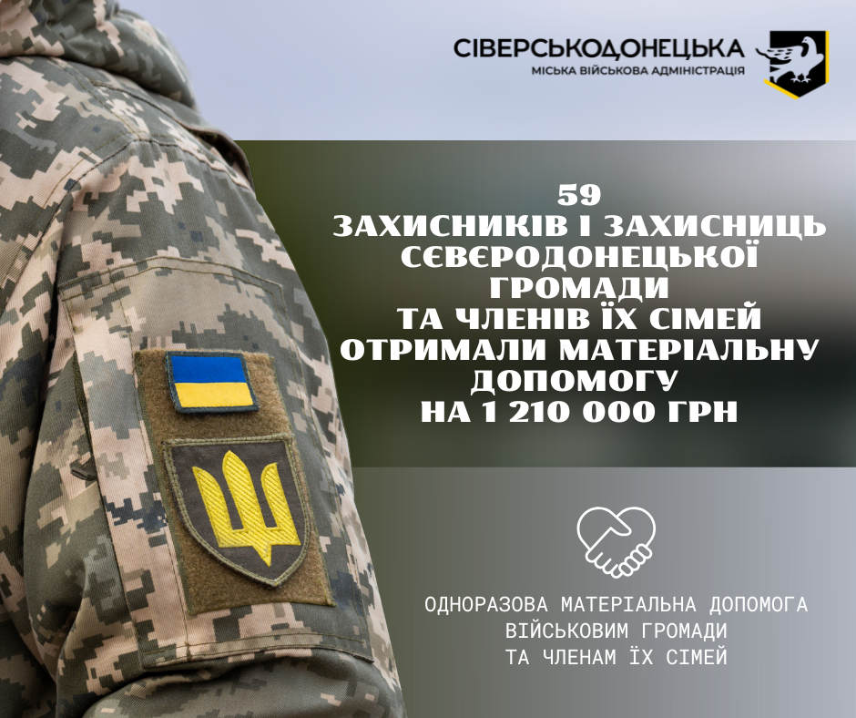 Заходи Комплексної програми підтримки Сєвєродонецькою міською територіальною громадою Захисників та Захисниць України та членів їх сімей на 2025 рік передбачають виплату різних видів матеріальної допомоги. Виплати отримали ще 59 військових Сєвєродонецької громади та члени їх сімей на загальну суму 1 210 тис. грн: