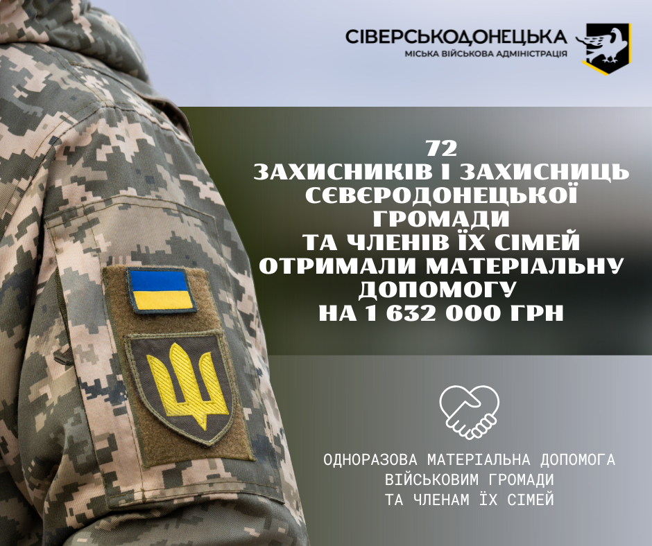 Заходи Комплексної програми підтримки Сєвєродонецькою міською територіальною громадою Захисників та Захисниць України та членів їх сімей на 2025 рік передбачають виплату одноразової матеріальної допомоги. Виплати отримали ще 72 військових Сєвєродонецької громади та членів їх сімей на загальну суму 1 632 000 тис. грн: