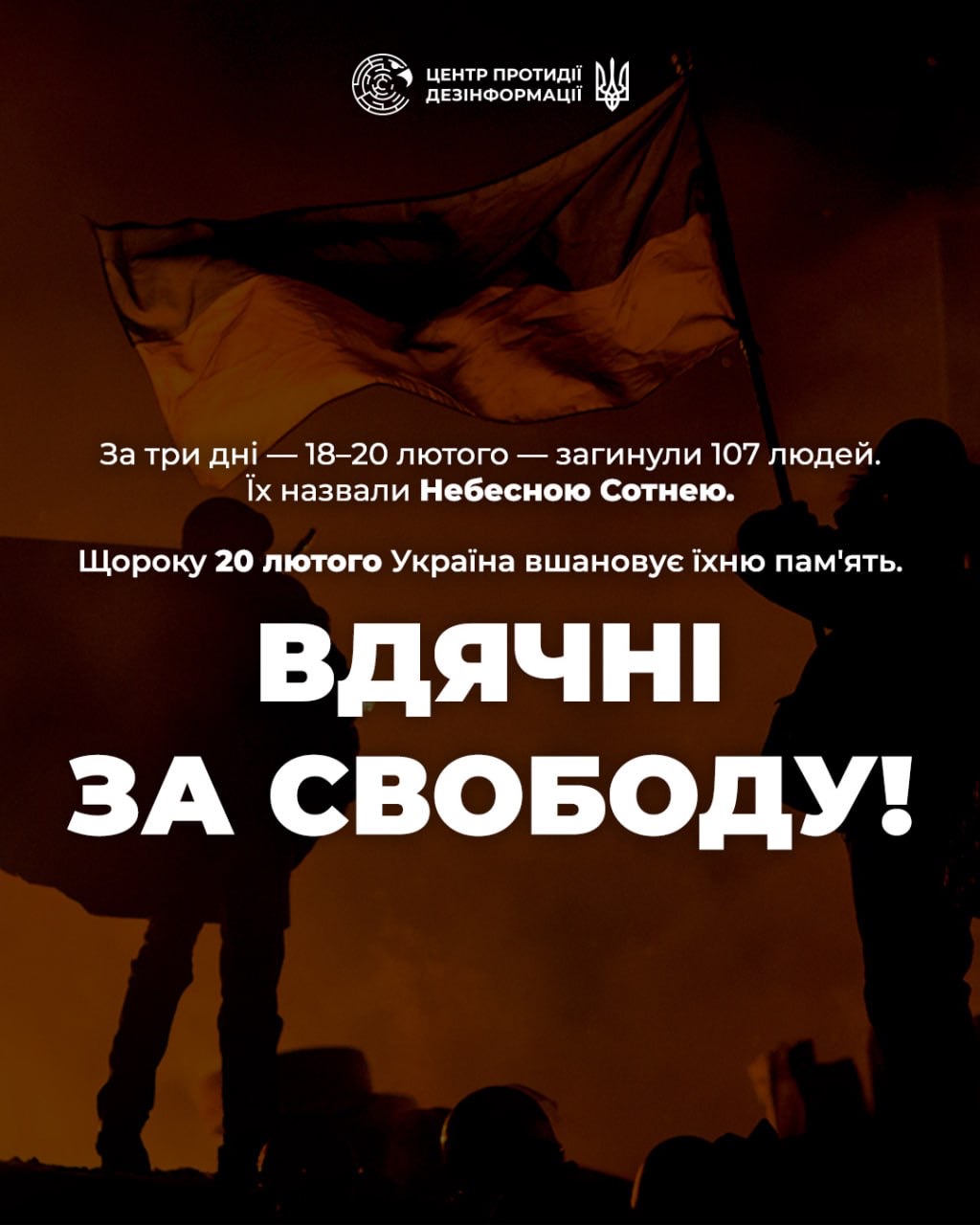 Україна вшановуватиме пам’ять Героїв Небесної Сотні – героїв першої перемоги у битві, що триває за збереження України на мапі світу, за нашу державність, щоб ми не дали себе поглинути у рази більшим за розміром, але цинічним і морально дрібним північно-східним сусідом.