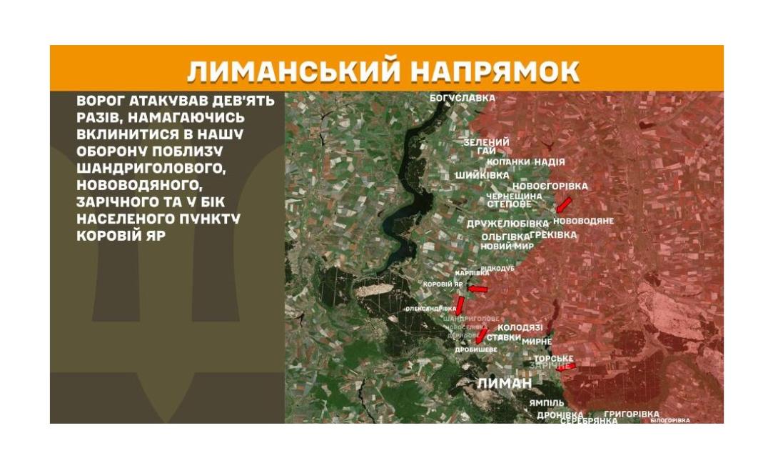 «Противник не спиняє тиск на Лиманському та Слов’янському напрямках. Лише за учора атакував там 19 разів. Штурмові дії росіяни здійснювали поблизу дев’ятьох населених пунктів. У смузі нашої відповідальності у чотирьох випадках застосували артилерію. Активно використовували fpv-дрони», – повідомив начальник Луганської обласної військової адміністрації Олексій Харченко.