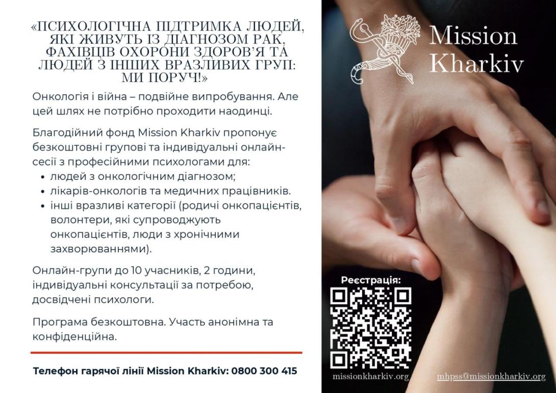 Психологічну підтримку надає служба ментального здоров’я Mission Kharkiv в межах проєкту «Ukraine Cancer Relief: Safe Passage for Care» за підтримки Direct Relief та включає безкоштовні онлайн-групи й індивідуальні психологічні консультації.