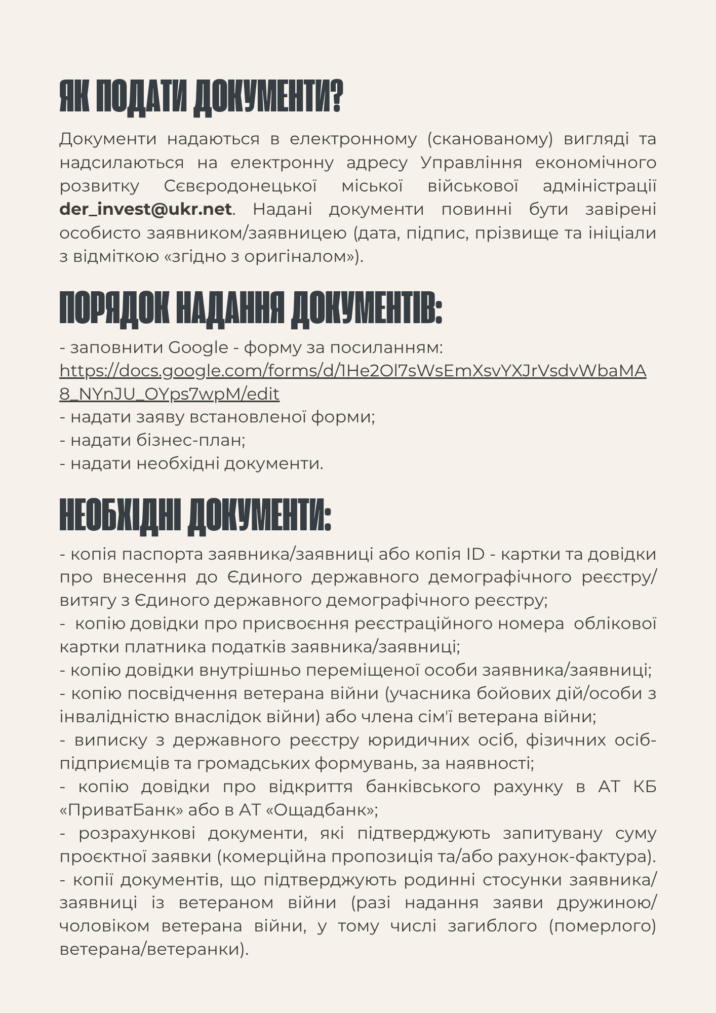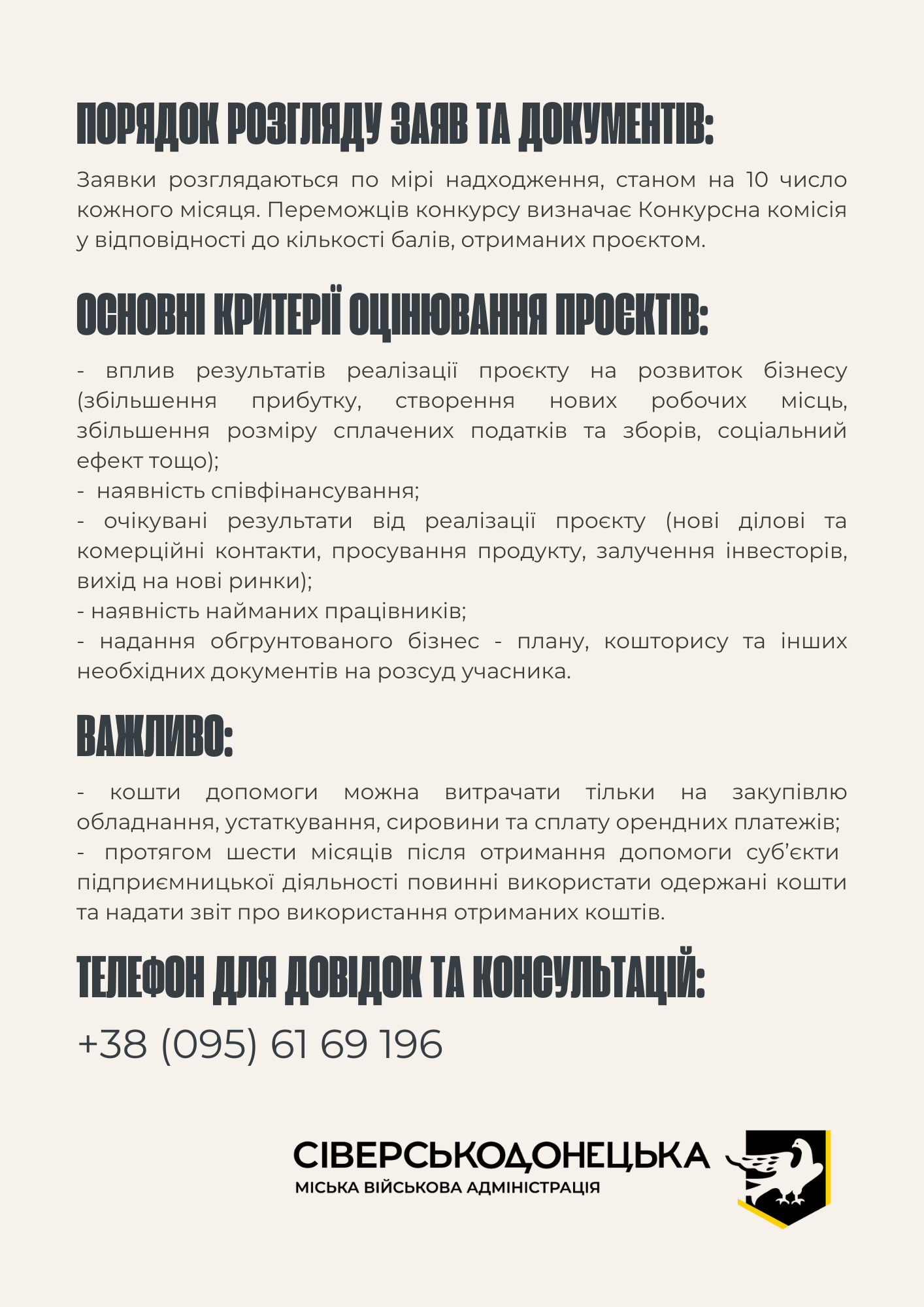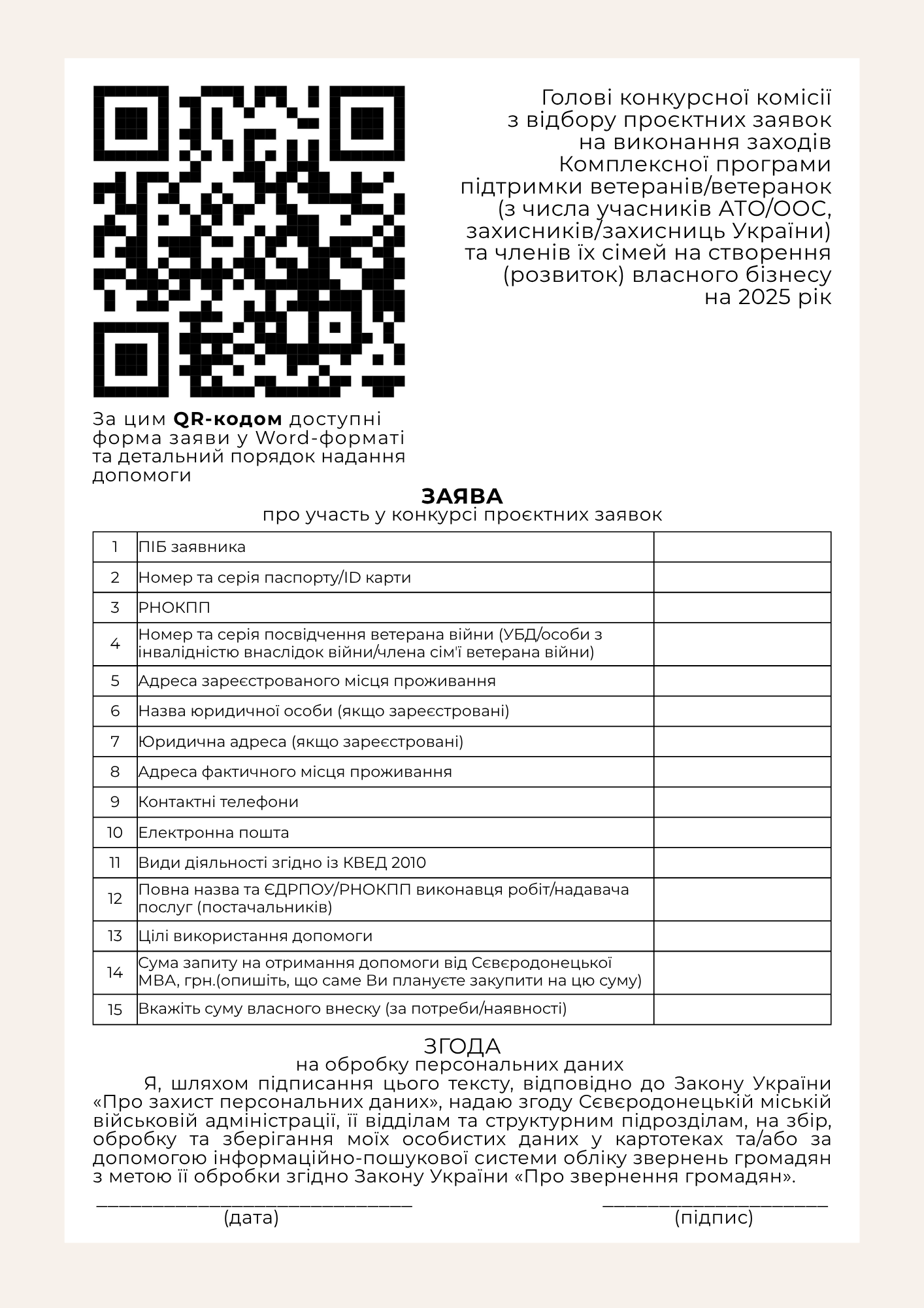 Допомога надається в рамках заходів Комплексної програми підтримки ветеранів/ветеранок (з числа учасників АТО/ООС, захисників/захисниць України) та членів їх сімей на створення (розвиток) власного бізнесу на 2025 рік, затвердженої розпорядженням начальника Сєвєродонецької міської ВА від 18.12.2024 №1102ВА (https://sed-rada.gov.ua/sites/default/files/archive-rozporyad-va/2024/rozporyadzhennya_nachalnika_sievierodoneckoyi_mva_no1102-va-1102va-id58145-dodatok.pdf).