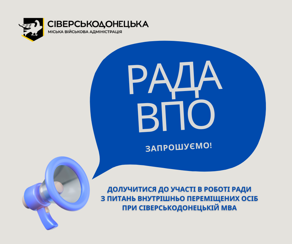 Сіверськодонецька міська військова адміністрація пропонує долучитися до участі в роботі Ради з питань внутрішньо переміщених осіб при Сіверськодонецькій міській військовій адміністрації Сіверськодонецького району Луганської області (далі – Рада).