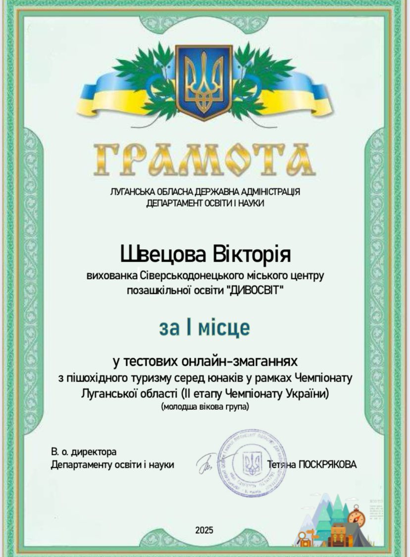 У змаганнях з пішохідного туризму у молодшій віковій групі І місця посіли вихованці гуртка "Пішохідний туризм": Головіна Поліна, Швецова Вікторія та Зєнцов Максим (Керівник - Віктор Кісляков).