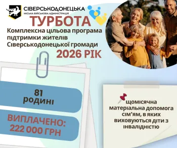 пт, 10 кві 2026 - 12:19 Щомісячну грошову допомогу отримує вже 81 сім'я Сіверськодонецької громади, в якій виховуються діти з інвалідністю