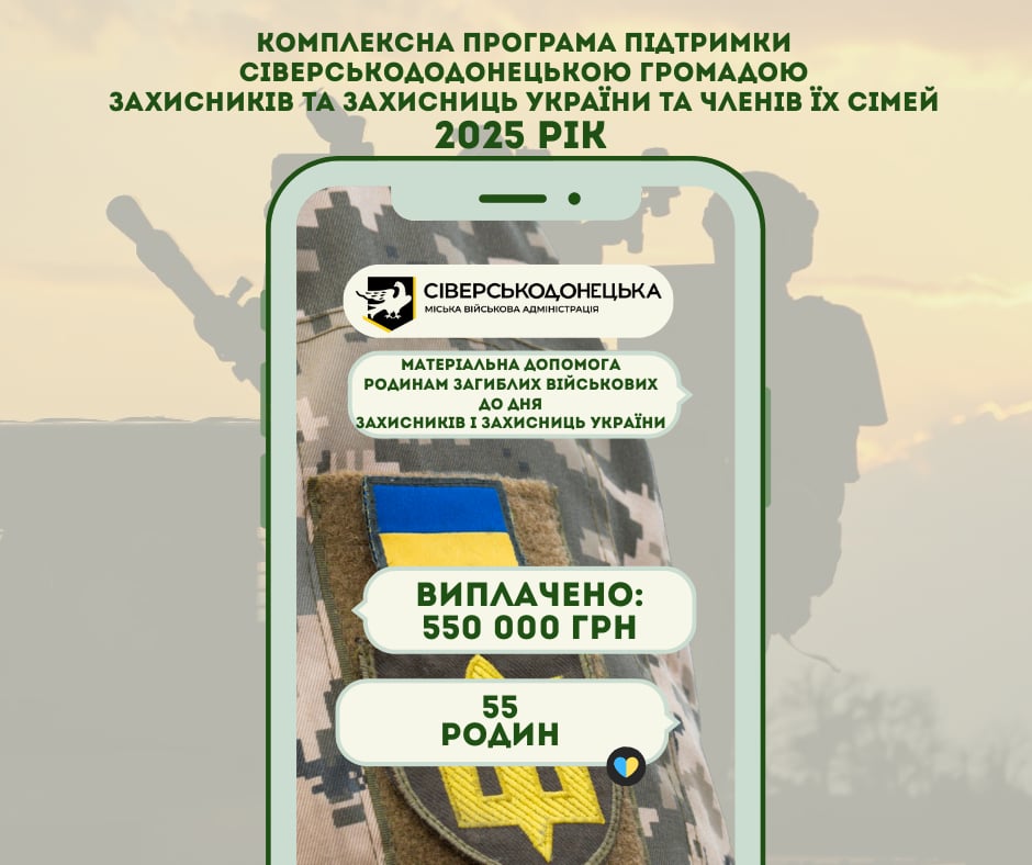 - 55 родин загиблих військових Сіверськодонецької громади до Дня Захисників і Захисниць України отримали по 10 000 грн матеріальної підтримки кожна.