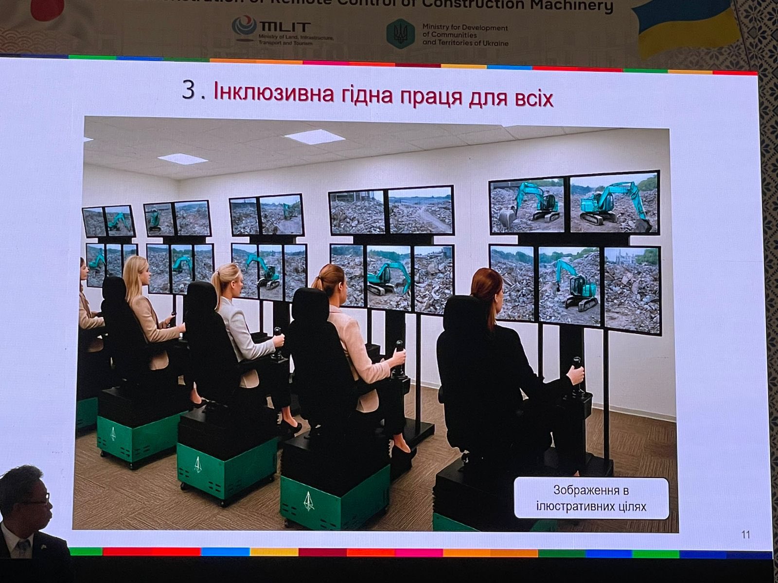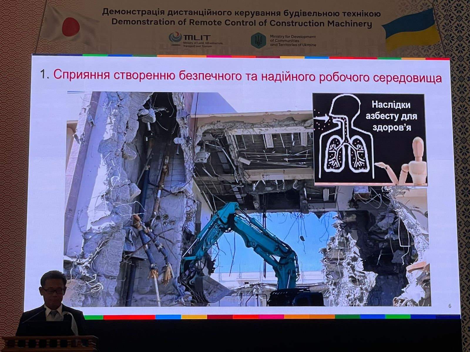 Відбулася презентація японських технологій дистанційного керування важкою будівельною технікою, до якої долучилася заступниця Міністра розвитку громад та територій Марина Денисюк, Посол Японії в Україні Масаші Накаґоме, заступник Міністра з інженерних питань Міністерства землі, інфраструктури, транспорту та туризму Японії Масару Коджіма, представники органів місцевого самоврядування, військових адміністрацій, ДСНС.