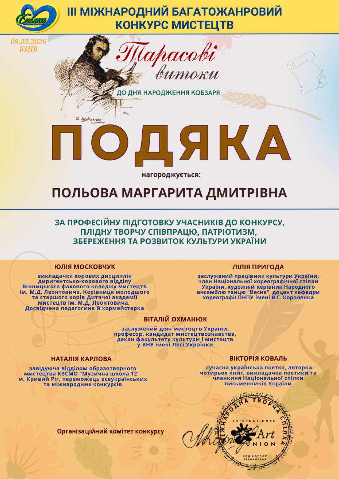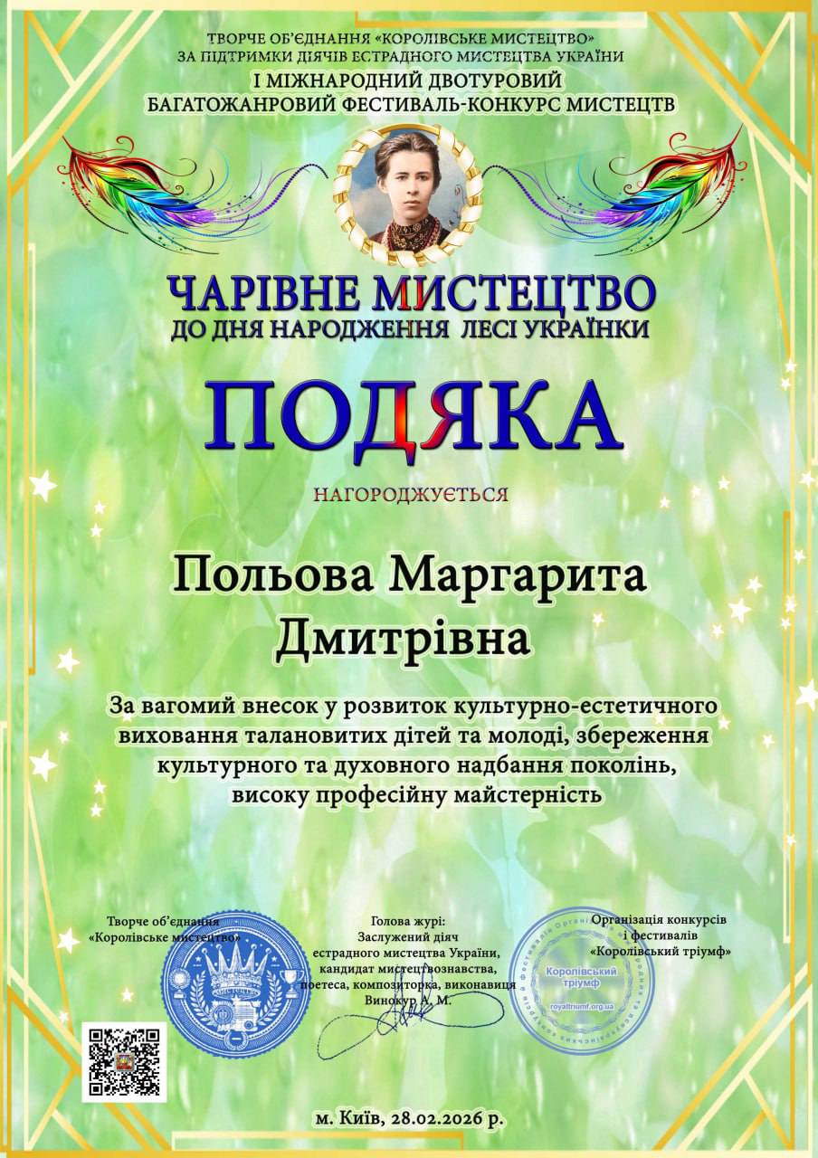 Учениця КЗ «Сіверськодонецька музична школа №1» Чумакова Єлизавета (2 клас, скрипка) здобула диплом лауреата І премії І Міжнародного двотурового багатожанрового фестивалю-конкурсу мистецтв «Чарівне мистецтво» до Дня народження Лесі Українки у номінації «Інструментальне мистецтво. Струнно-смичкові інструменти» і здобула І місце на Міжнародному фестивалі-конкурсі KYIV–TORONTO 2026.